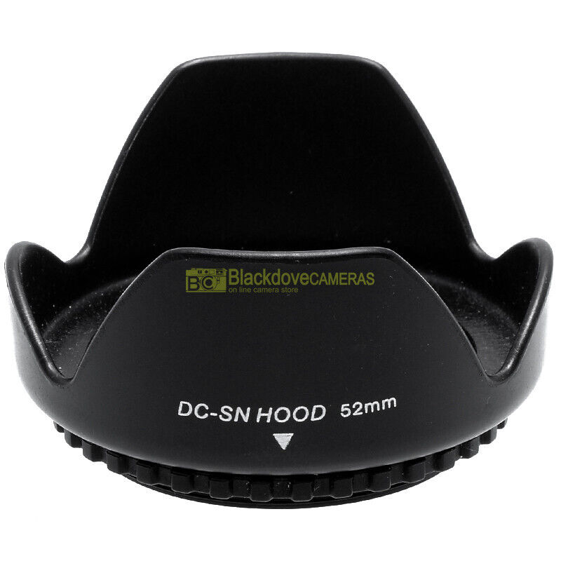 52mm. paraluce a petalo universale, innesto a vite. Ruotabile. Lens hood.